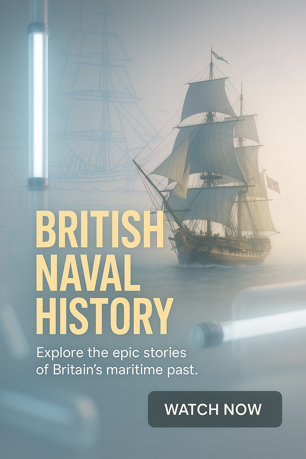 /Collection: /by davooda/Type: PNG/A visually engaging promotional graphic highlighting British naval history. The image features a historical ship illustration with modern design elements, ideal for attracting viewers to maritime documentaries.