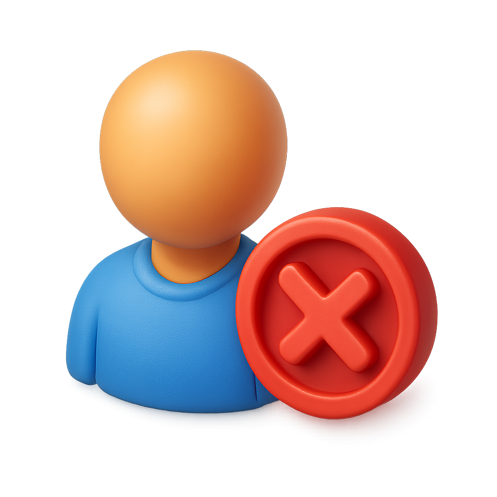 A 3D icon depicting a character with a blue shirt and a red rejection symbol beside it. The design features a transparent background and a three-quarter isometric view, emphasizing a modern look.