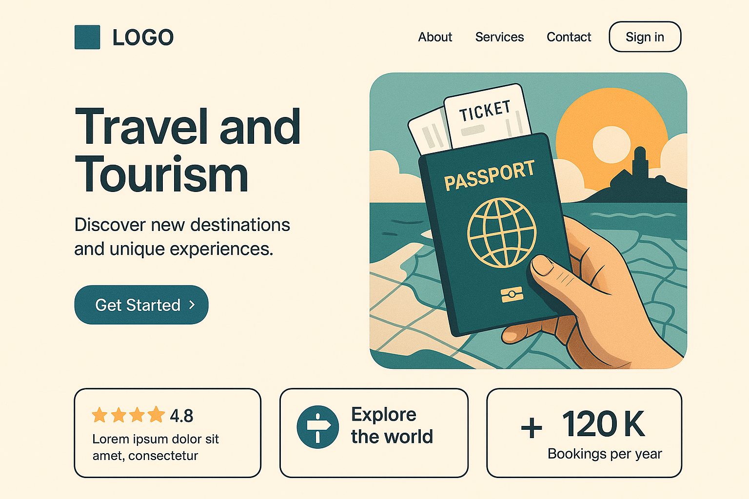 A visually appealing landing page design for travel and tourism, featuring a hand holding a passport and tickets, with a modern layout and clear call-to-action buttons.
