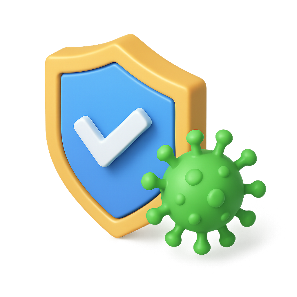 /Collection: /by davooda/Type: PNG/A colorful 3D icon featuring a shield with a check mark and a green virus illustration. The design has a transparent background and presents a volumetric, isometric view.