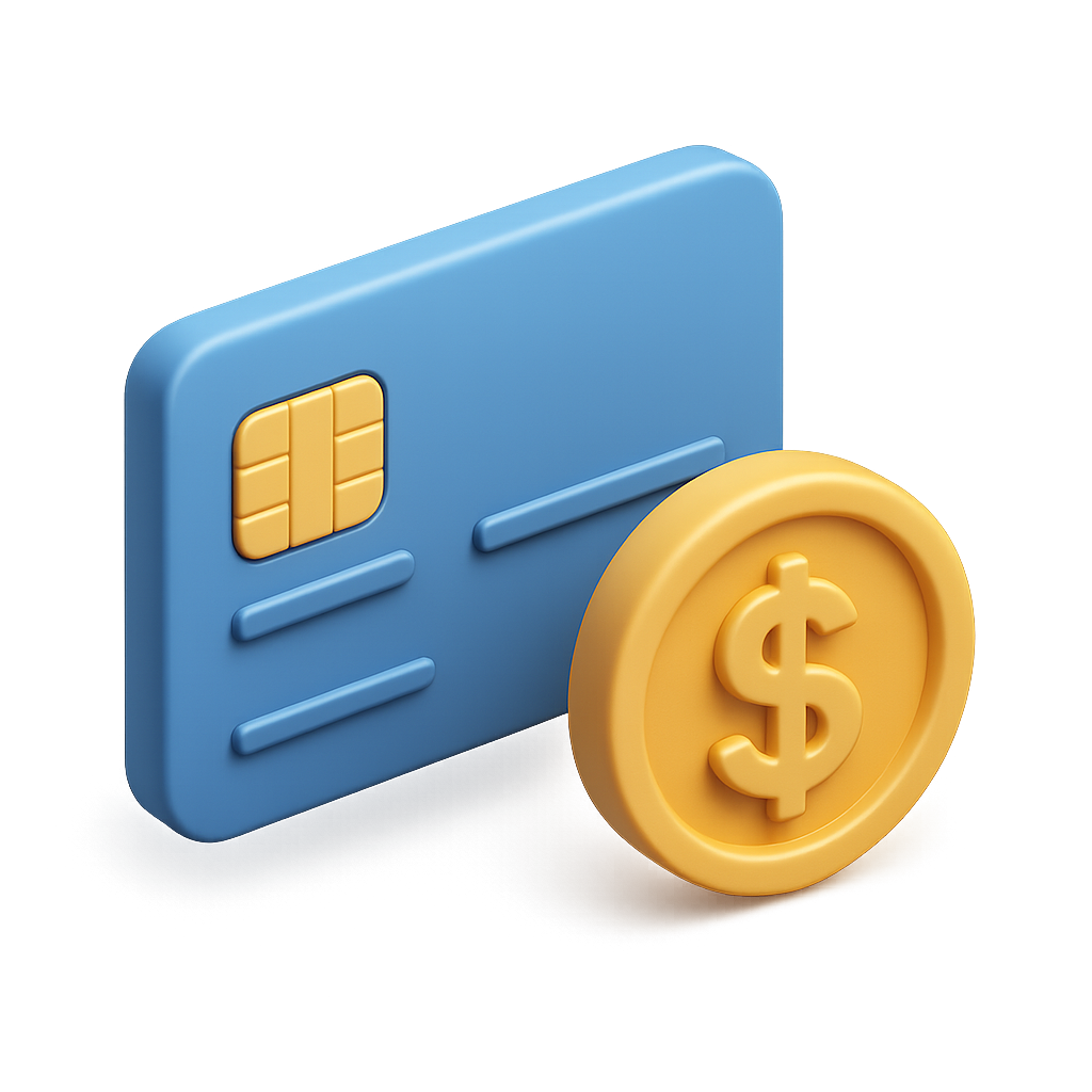 A visually appealing 3D payment icon featuring a blue credit card and a yellow dollar coin, set against a dark gradient background. The design emphasizes a modern and isometric style.