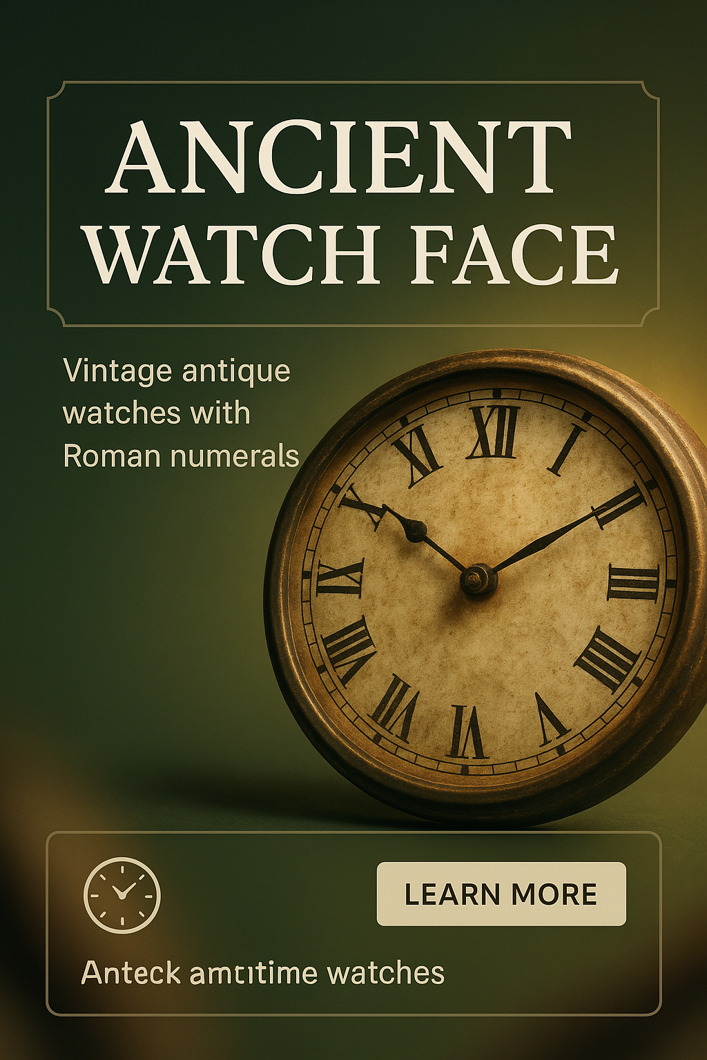 This is a promotional graphic featuring a vintage watch face with Roman numerals. The elegant design targets watch enthusiasts and collectors, encouraging them to learn more.
