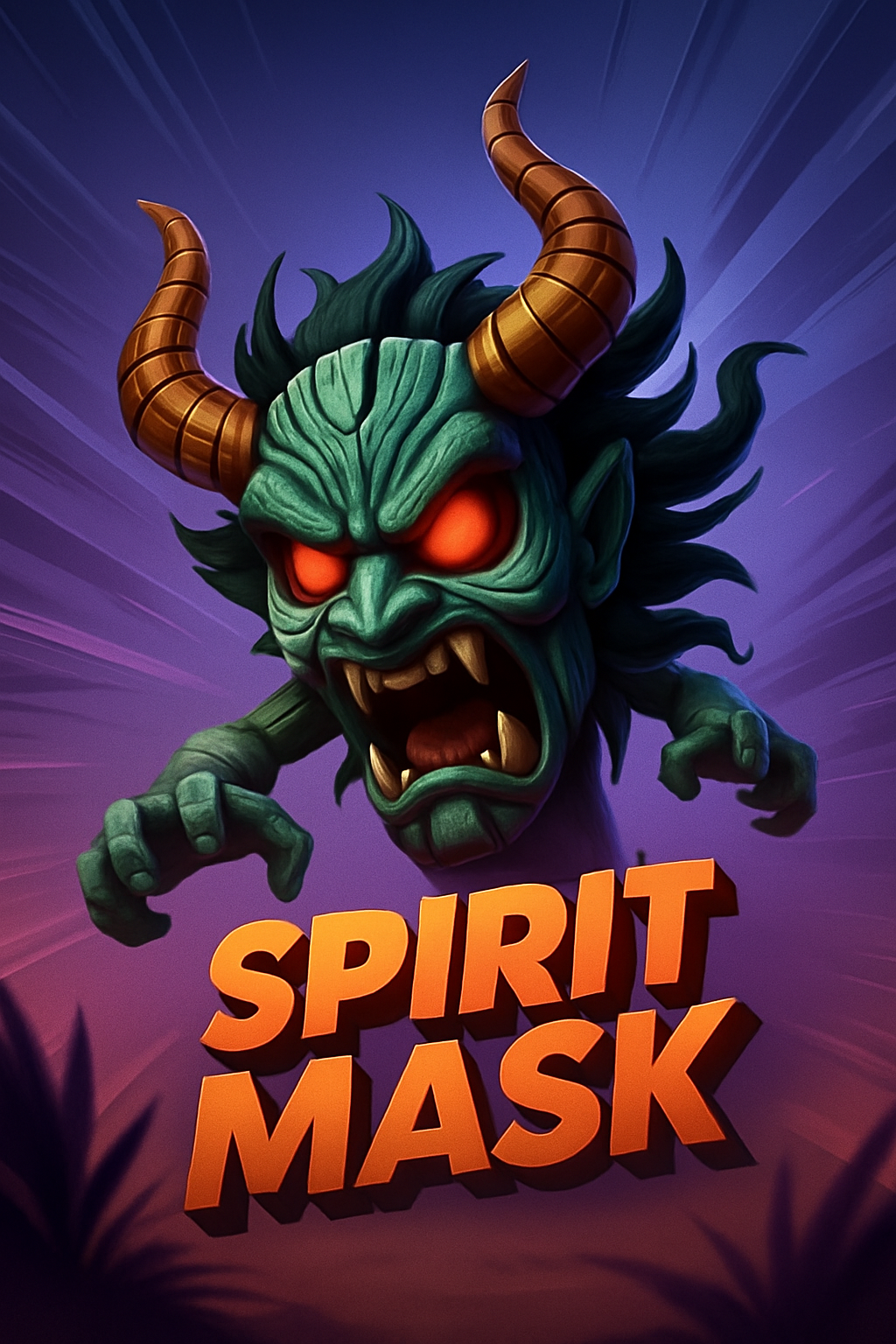/Collection: /by davooda/Type: PNG/A vibrant illustration of a spirit mask with fierce features, showcasing dynamic lines and a bold title. The background transitions smoothly, enhancing the dramatic effect.