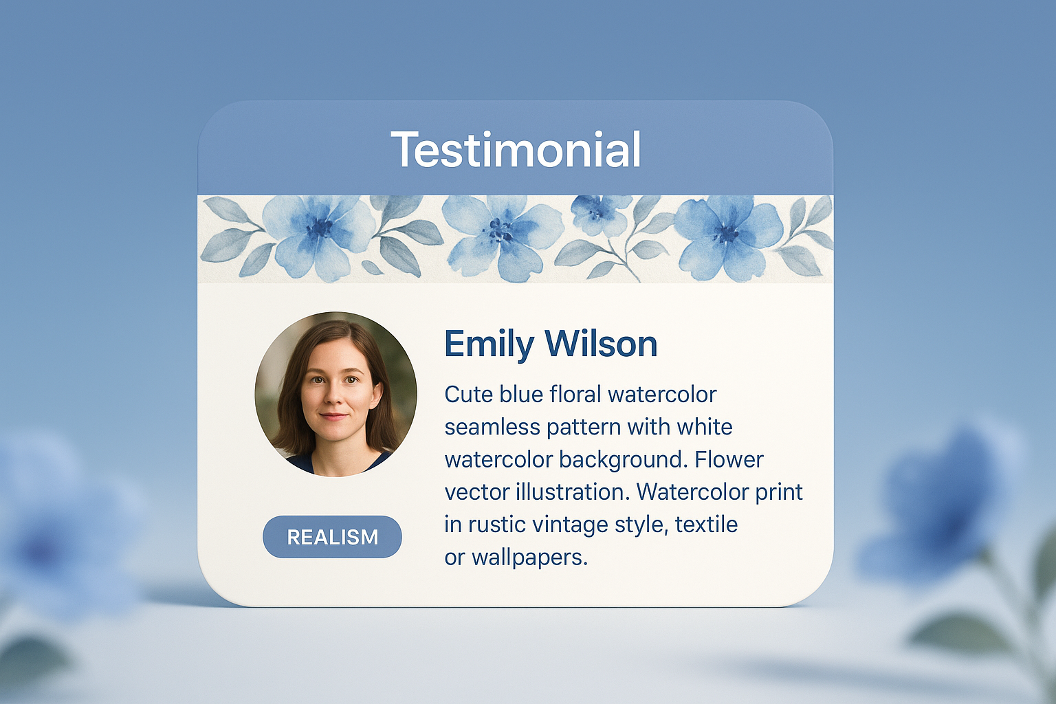 A visually appealing testimonial block featuring a circular photo of a woman, her name, and a heartfelt testimonial text. The background showcases a cute blue floral watercolor pattern.
