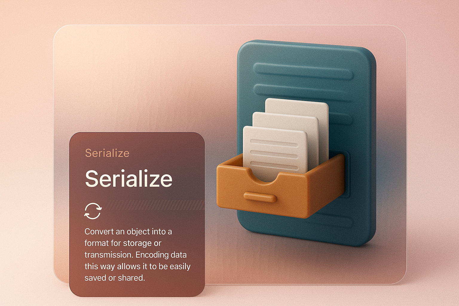 /Collection: /by davooda/Type: PNG/A sleek, modern web design featuring a 3D illustration of a serialization concept. The design incorporates layered elements with a gradient background and a prominent visual display of documents in a drawer.