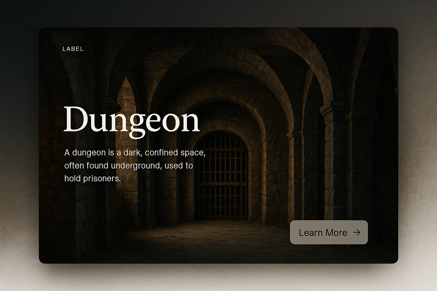 A visually striking web design concept for a dungeon theme, featuring a dark gradient background, elegant typography, and a clear call-to-action button.