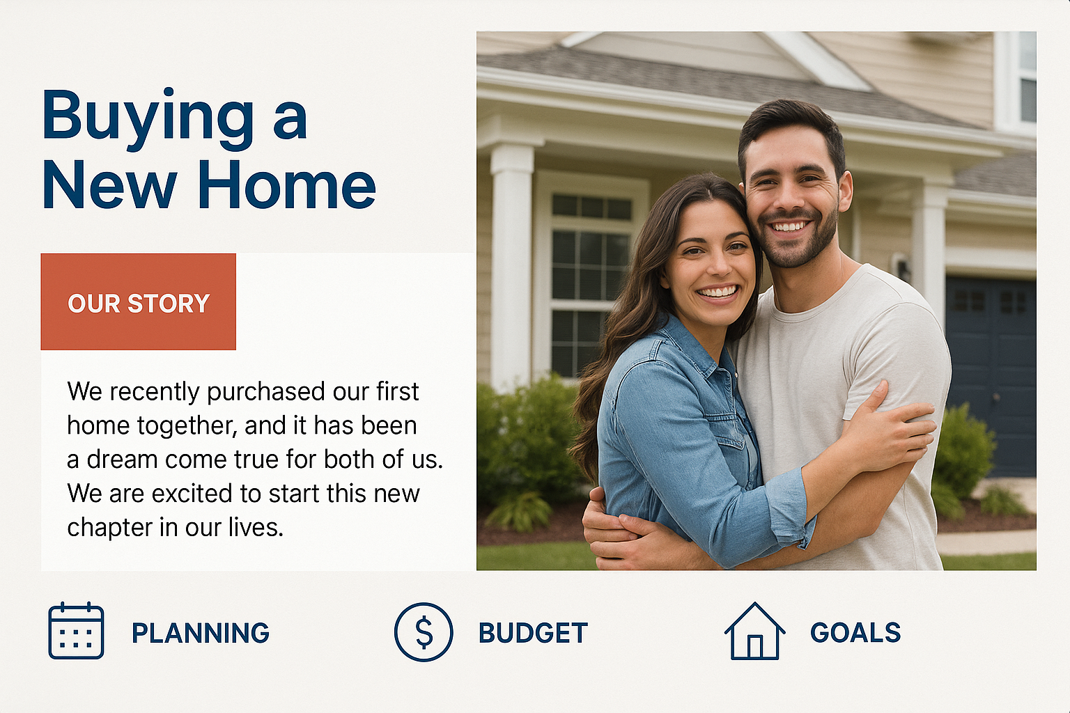 Informative graphic showcasing a couple celebrating their first home purchase, designed for personal storytelling and engagement on social media or blogs.