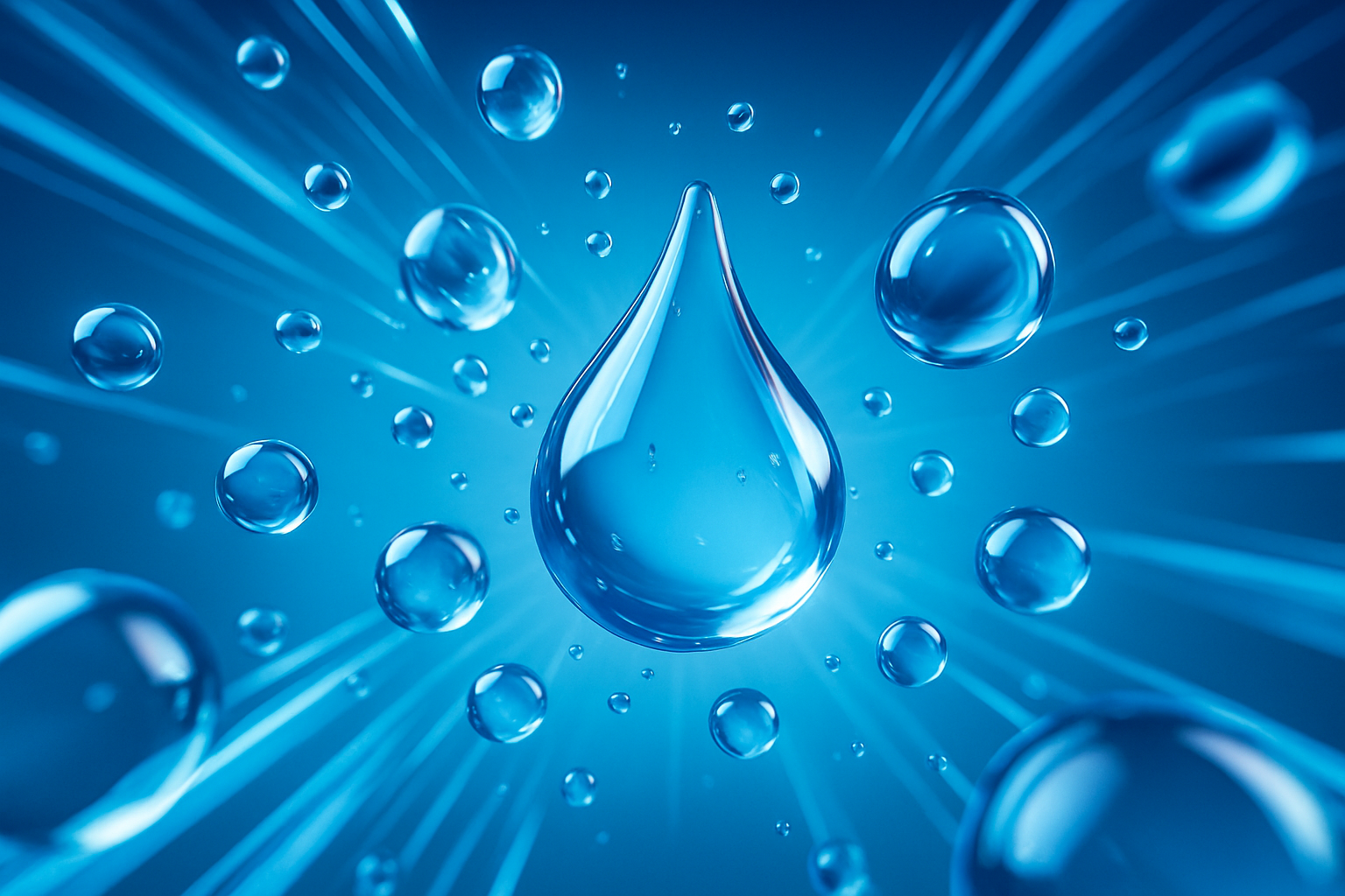 Realistic Water Drops and Clear Bubbles on Light Blue Background