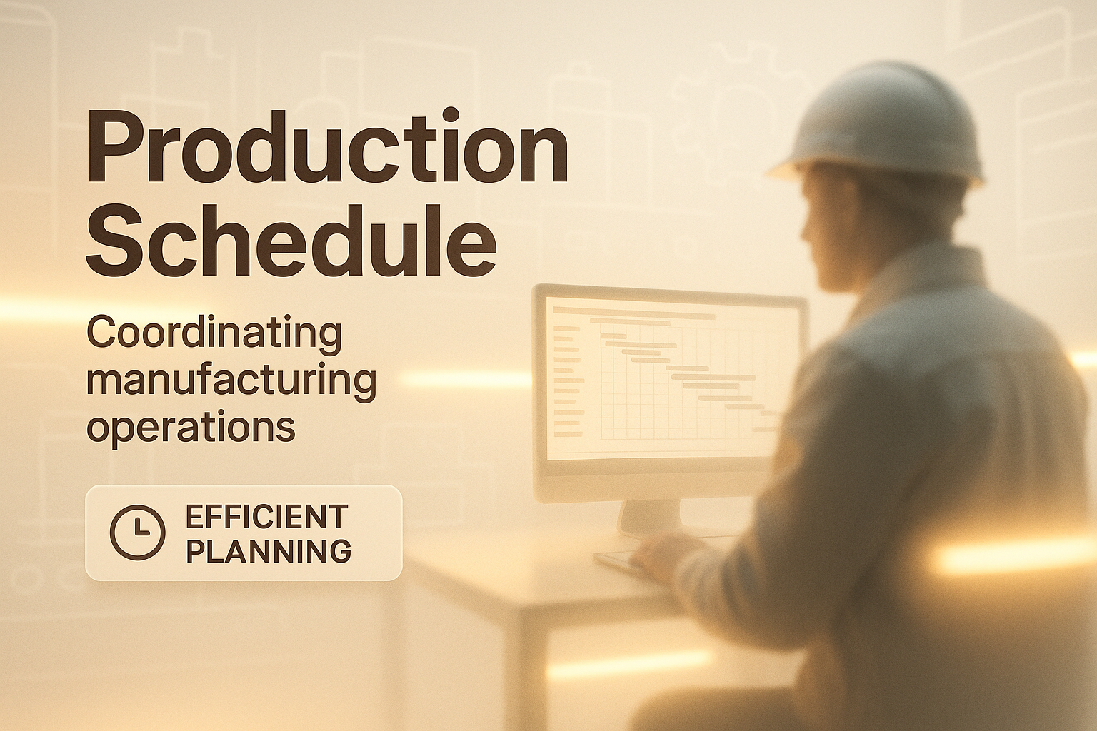 /Collection: /by davooda/Type: PNG/Professional graphic illustrating a production schedule for manufacturing operations, featuring a blurred figure at a computer with a modern design, ideal for corporate presentations.