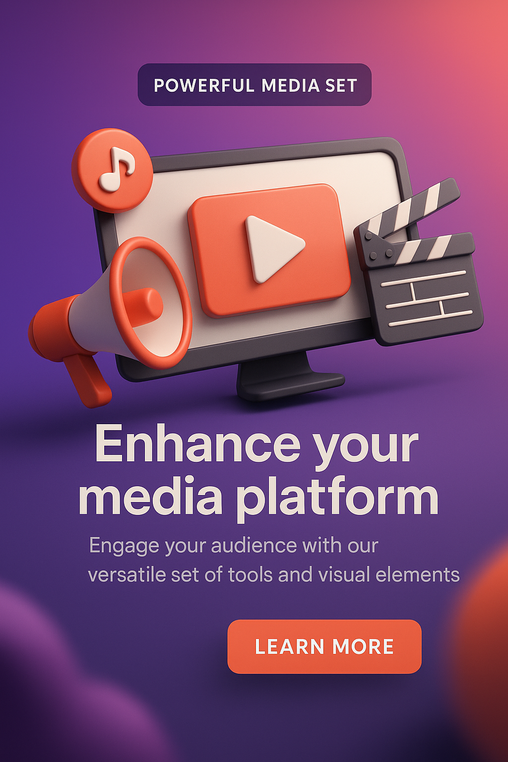 A vibrant 3D graphic showcasing tools for enhancing media platforms. Ideal for digital marketing, this banner engages viewers with a clear call to action.