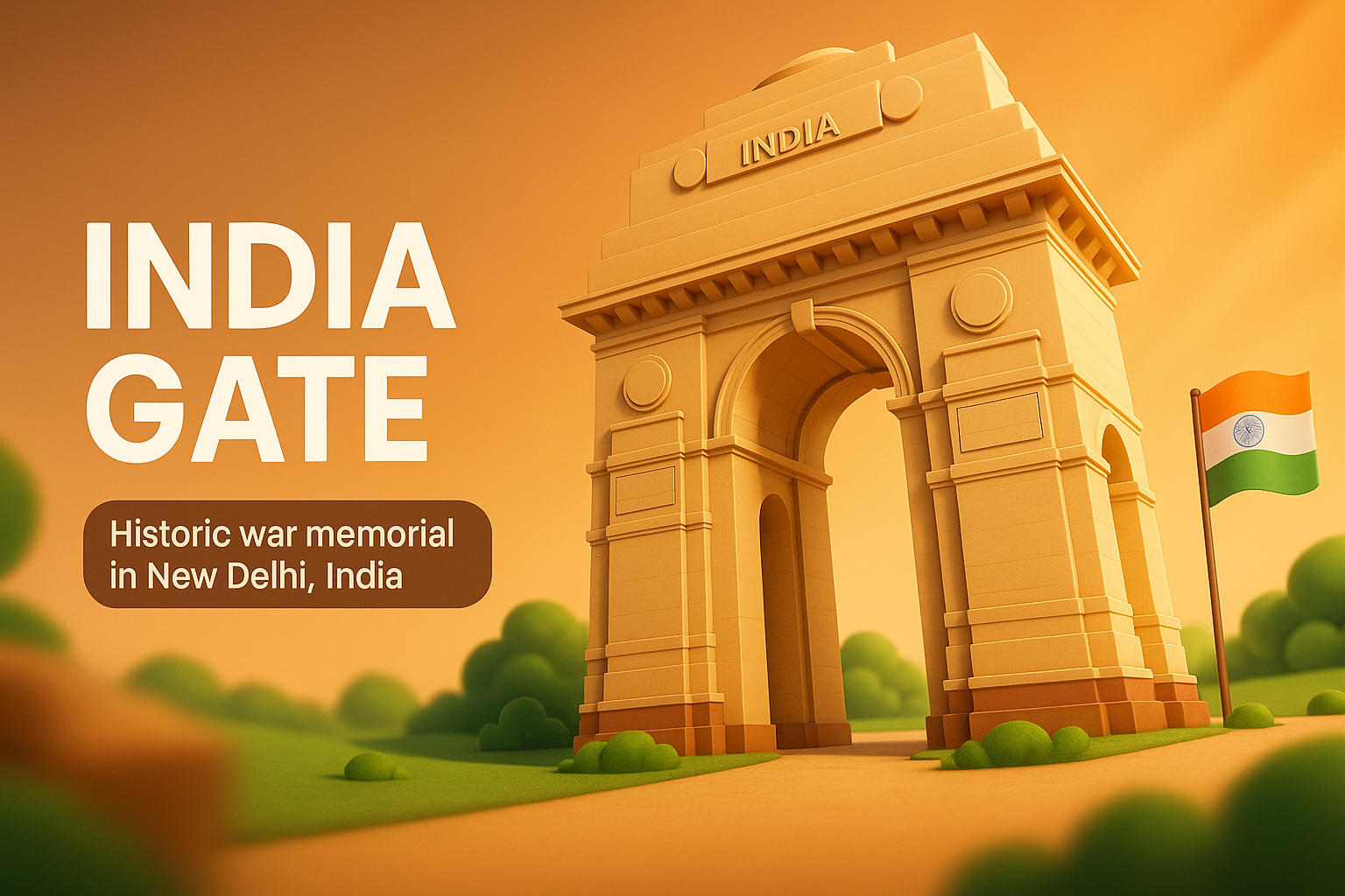 Stylized 3D illustration of the India Gate, a historic war memorial in New Delhi, featuring a vibrant sunset backdrop and an Indian flag, ideal for cultural or travel-themed content.
