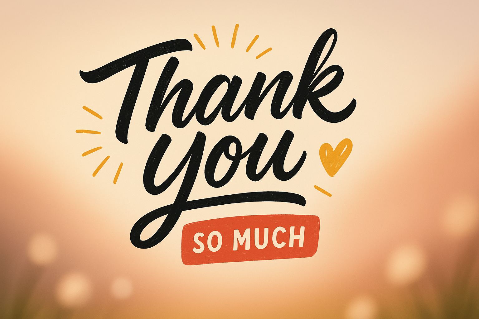 A warm, inviting graphic featuring a heartfelt 'Thank You' message with playful typography and a soft background, ideal for expressing gratitude in digital communications.