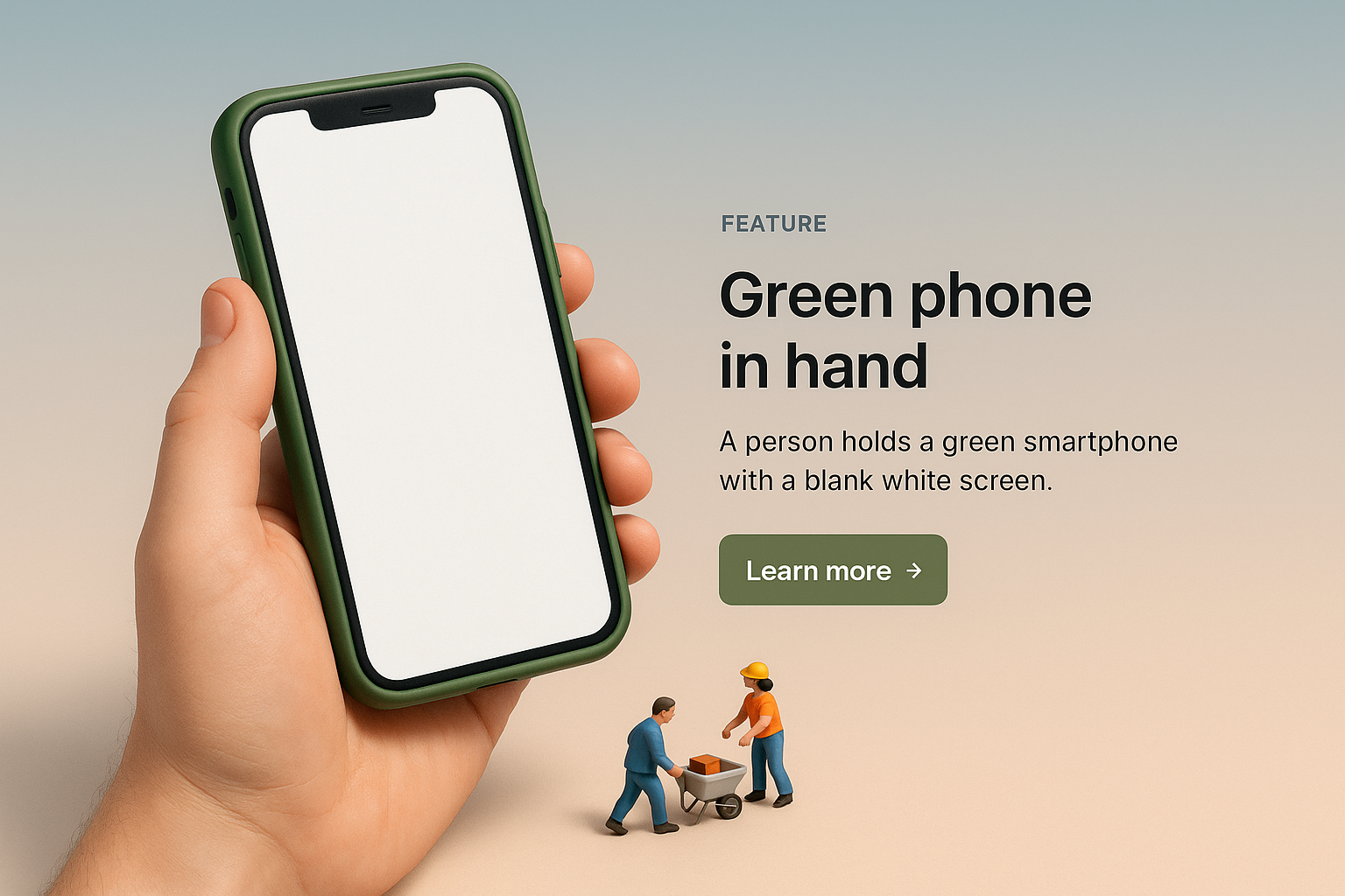 A realistic 3D scene featuring a person holding a green smartphone with a blank screen. Miniature figures are engaged in activities nearby, creating a dynamic composition.