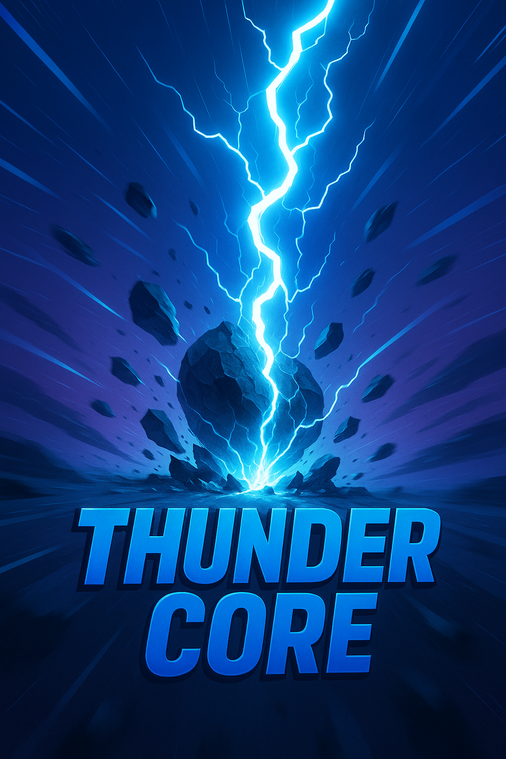 /Collection: /by davooda/Type: PNG/A vivid illustration of a thunder core, featuring dramatic lightning striking a central rock element. The dynamic lines radiate outwards, creating a sense of movement and energy against a smooth gradient background.