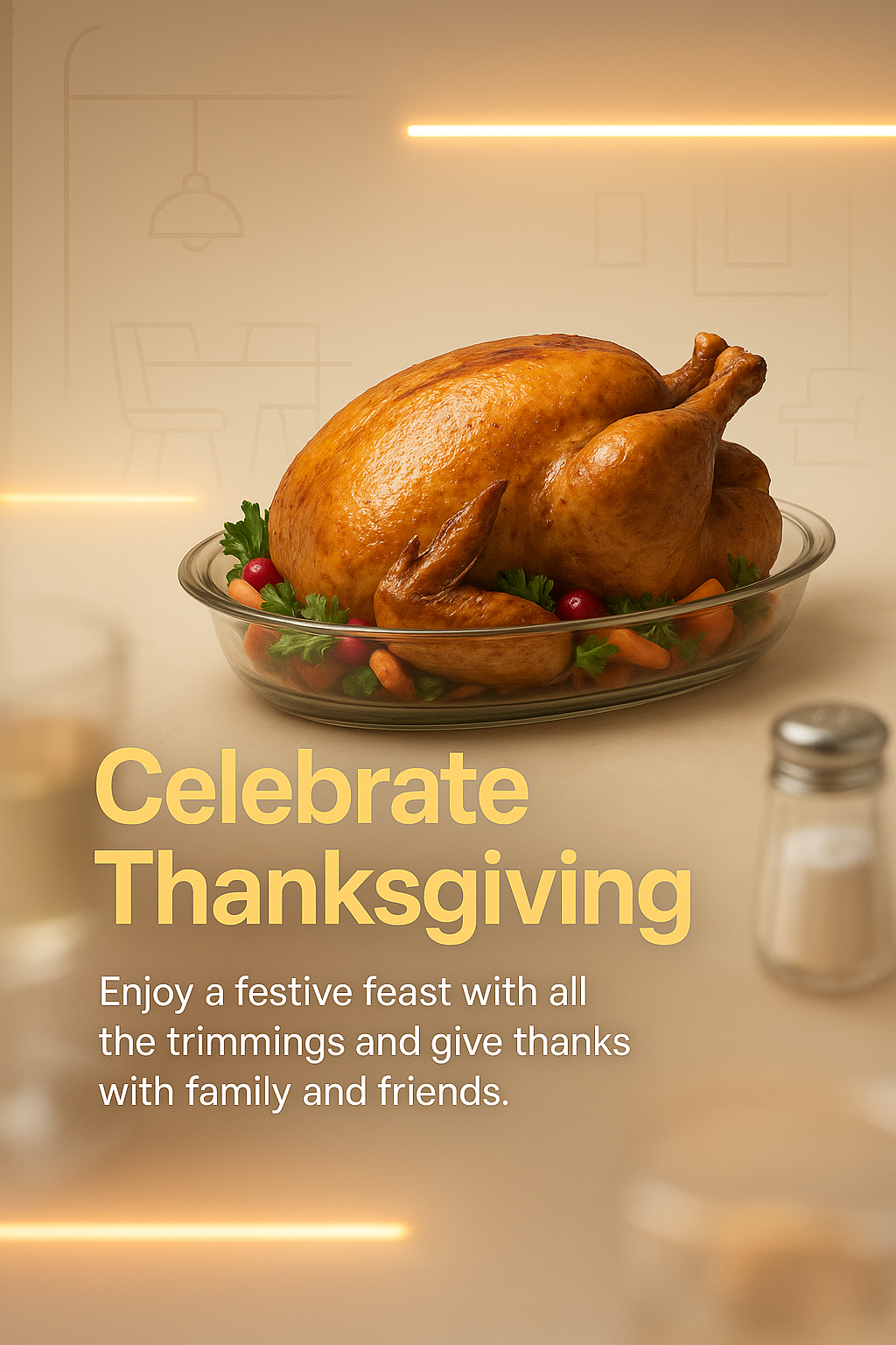 /Collection: /by davooda/Type: PNG/Inviting Thanksgiving-themed graphic featuring a beautifully presented turkey, ideal for holiday promotions or social media posts, designed with warm colors and festive elements.
