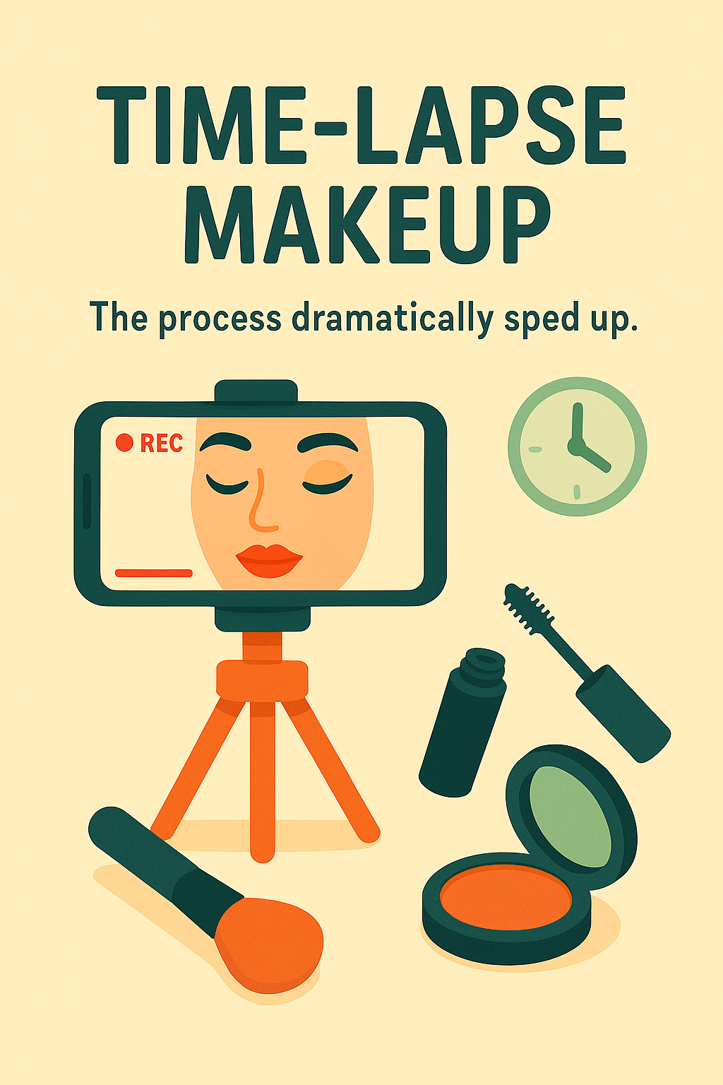 A vibrant and engaging graphic illustrating the concept of time-lapse makeup application, featuring a smartphone recording a makeup tutorial. Ideal for beauty blogs or social media posts.
