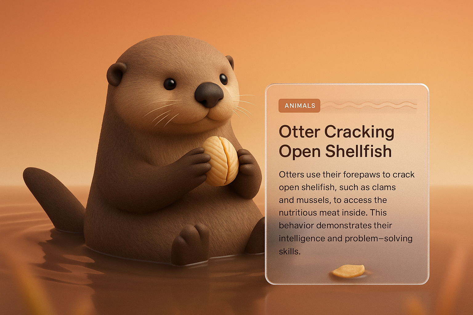 /Collection: /by davooda/Type: PNG/A charming 3D illustration of an otter using its forepaws to crack open shellfish. The background features a smooth gradient, enhancing the focus on the otter's playful behavior.