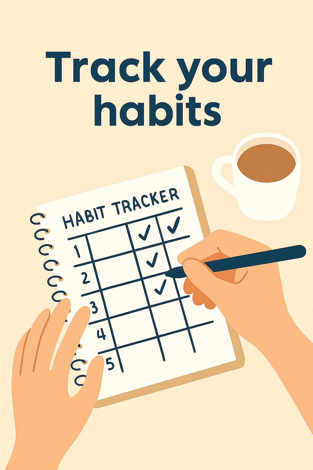 Illustrative graphic depicting a hand writing on a habit tracker notebook, emphasizing organization and personal development. Ideal for lifestyle blogs or productivity apps.