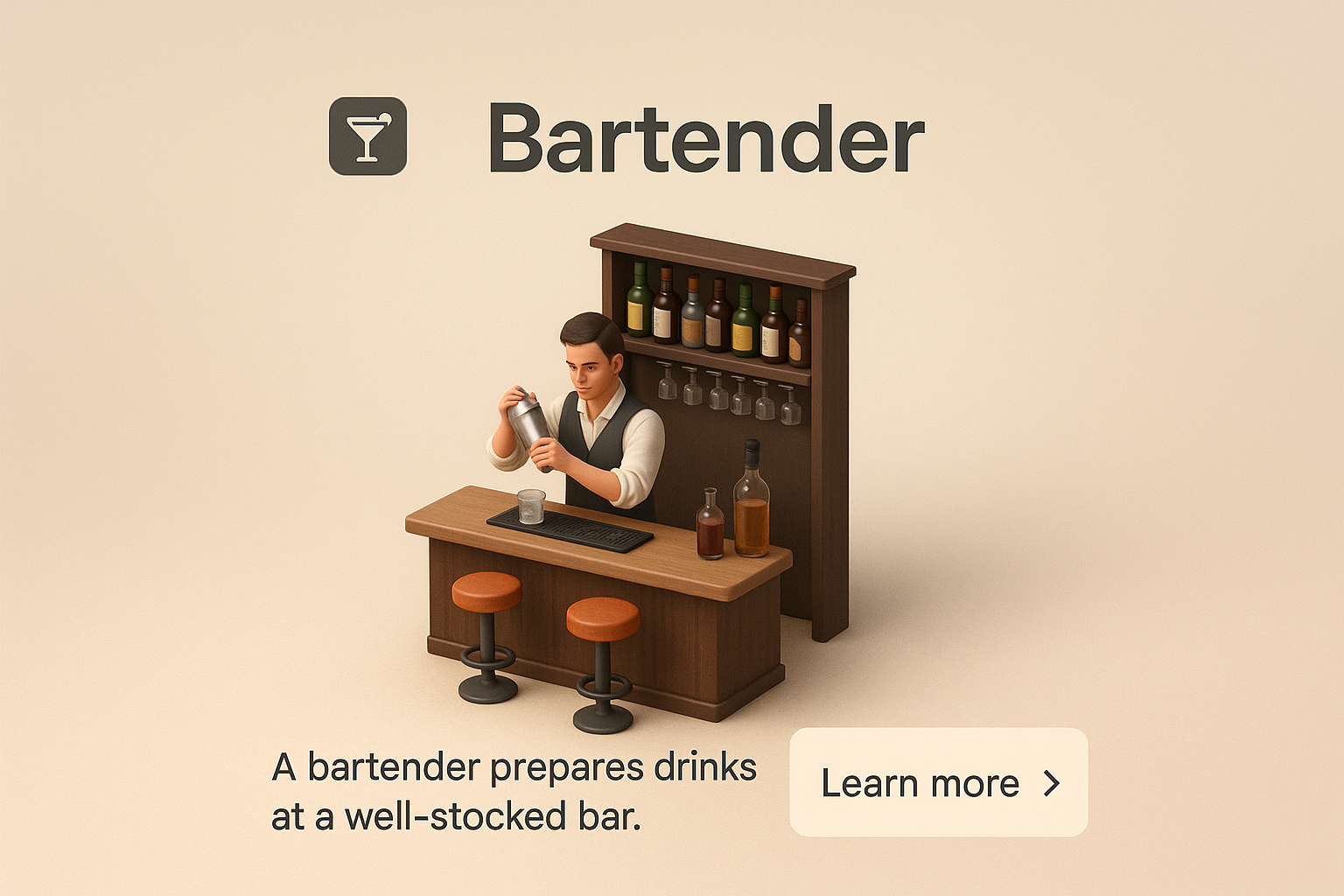 /Collection: /by davooda/Type: PNG/A realistic 3D scene depicting a bartender preparing drinks at a well-stocked bar. The image captures a zoomed-out perspective, showcasing the bar's environment and small-scale details.