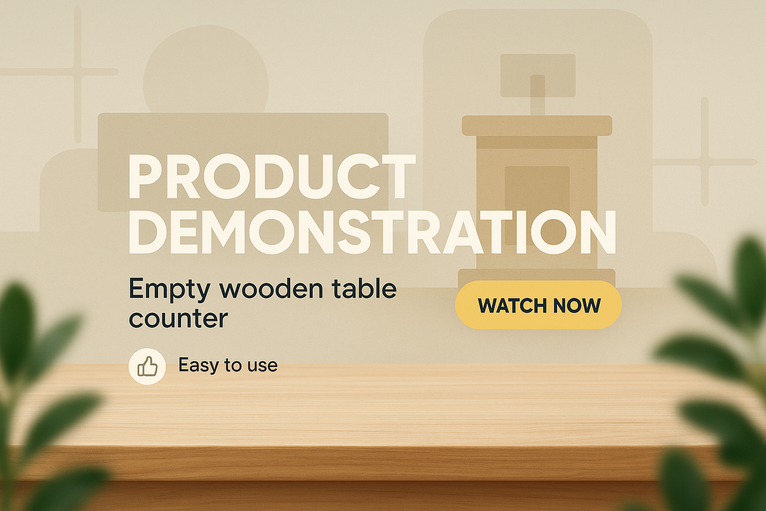 Stylish promotional image showcasing a product demonstration with a wooden table counter. Ideal for marketing materials and video content.