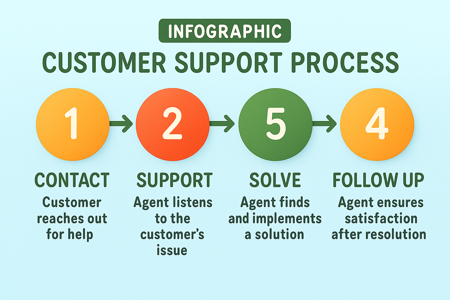 Informative infographic illustrating the customer support process with clear steps and vibrant colors, suitable for training or educational purposes.