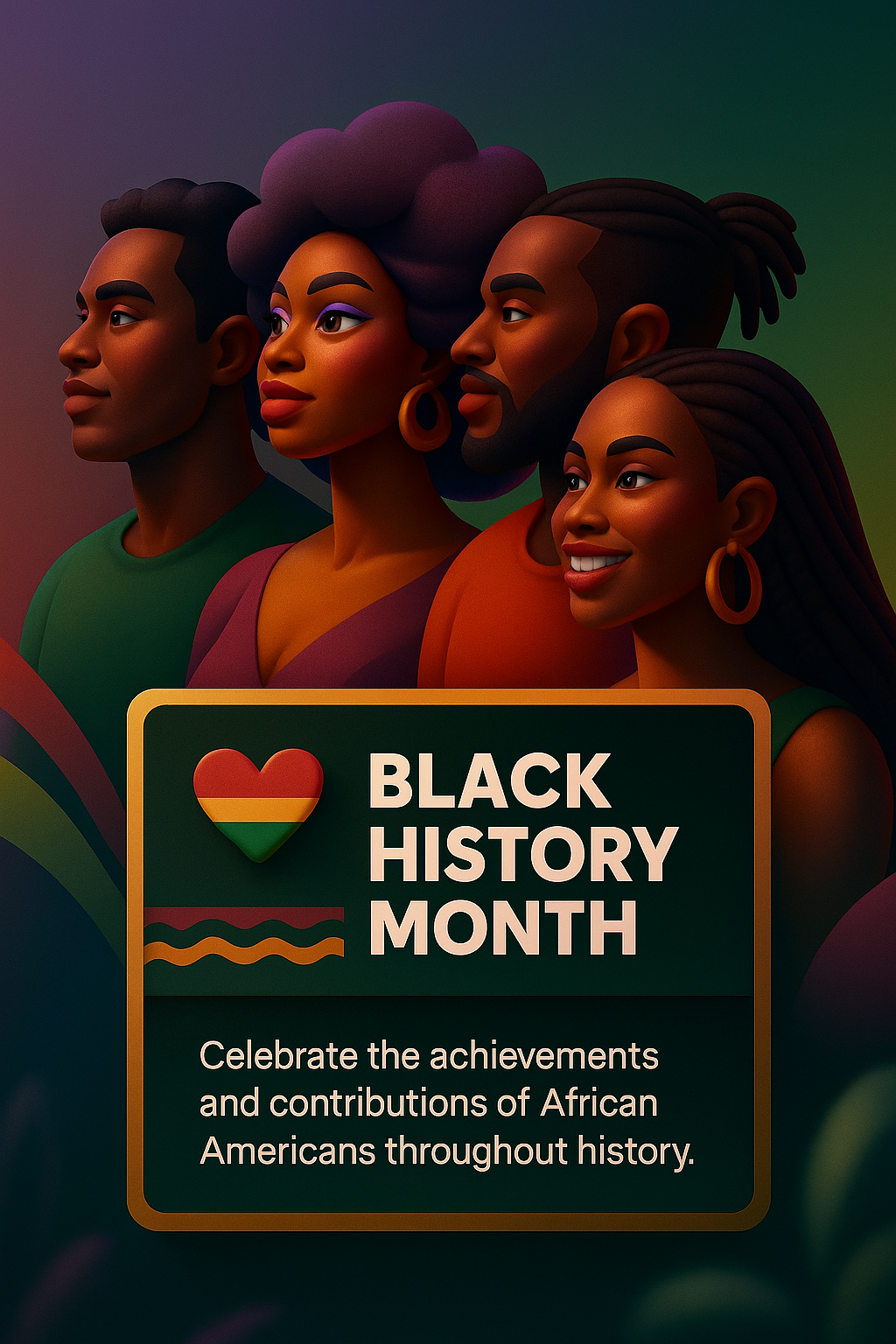 /Collection: /by davooda/Type: PNG/A vibrant illustration celebrating Black History Month, featuring a diverse group of individuals with distinct hairstyles and expressions. The design incorporates a warm color palette and themed elements to emphasize racial equality and justice.