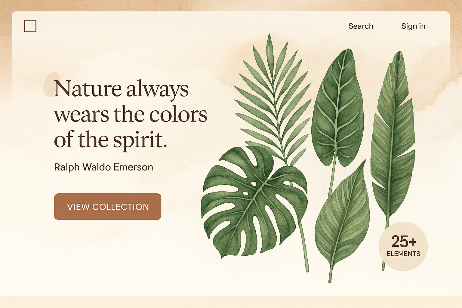 /Collection: /by davooda/Type: PNG/A beautifully designed tropical landing page featuring watercolor green leaves. The quote by Ralph Waldo Emerson adds a serene touch, complemented by a call-to-action button.