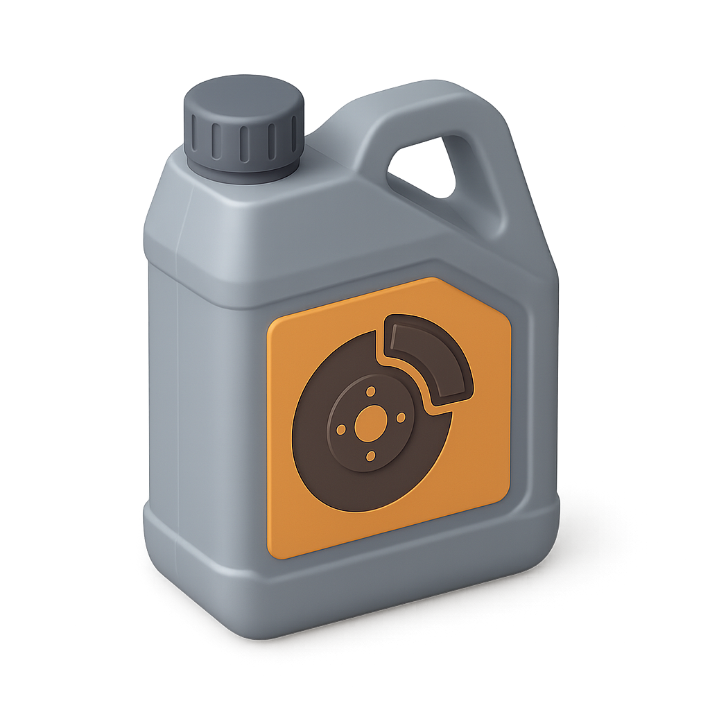 A 3D rendering of a brake fluid container, featuring a gray bottle with a distinct brake symbol on an orange background. The design emphasizes a modern, isometric style.