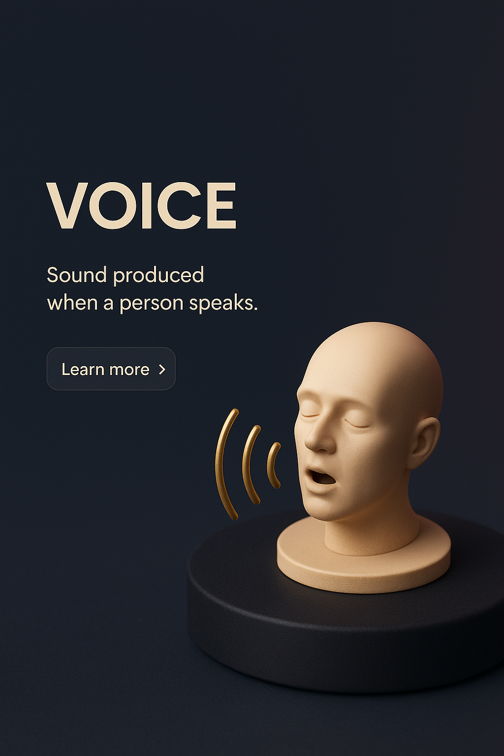 /Collection: /by davooda/Type: PNG/A realistic 3D representation of a human head emitting sound waves, set against a dark gradient background. Features minimal text and a call-to-action button.