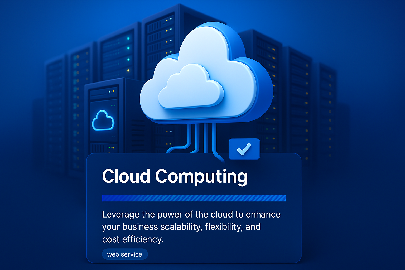 /Collection: /by davooda/Type: PNG/A vibrant 3D illustration depicting cloud computing technology with servers in the background. The design features a cloud icon and a detailed text block highlighting cloud service benefits.