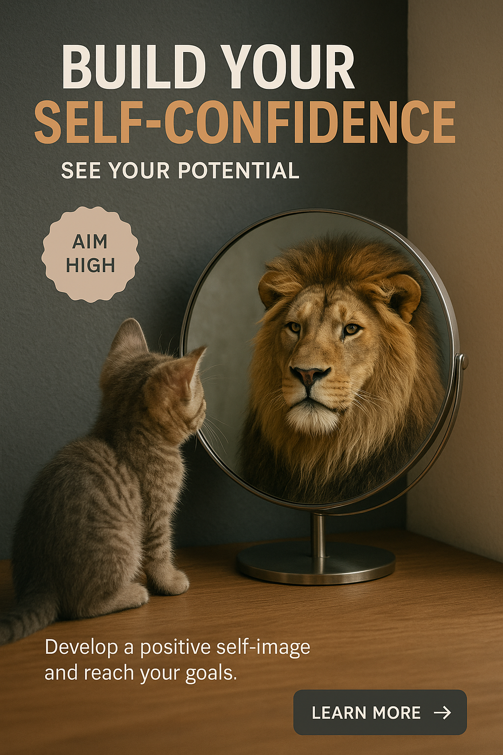 /Collection: /by davooda/Type: PNG/A kitten gazes into a round mirror, where the reflection reveals a majestic lion. The image symbolizes self-confidence and potential, featuring a warm color palette.