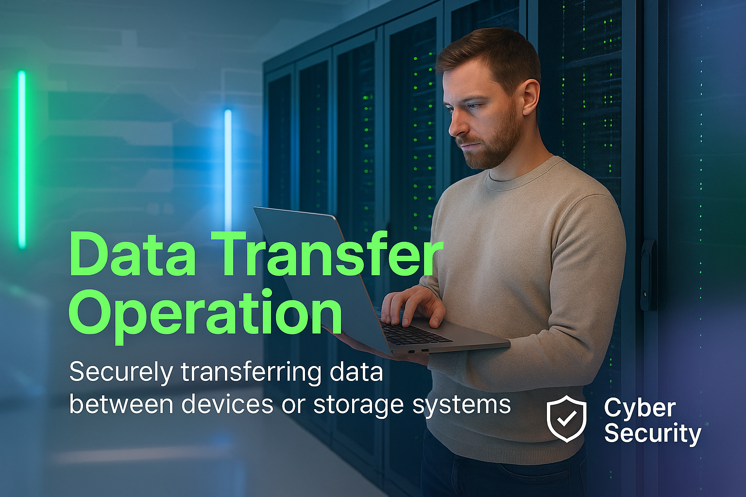 Modern graphic depicting a data transfer operation in a cyber security context. The image features a man using a laptop amid server racks, emphasizing secure data handling.