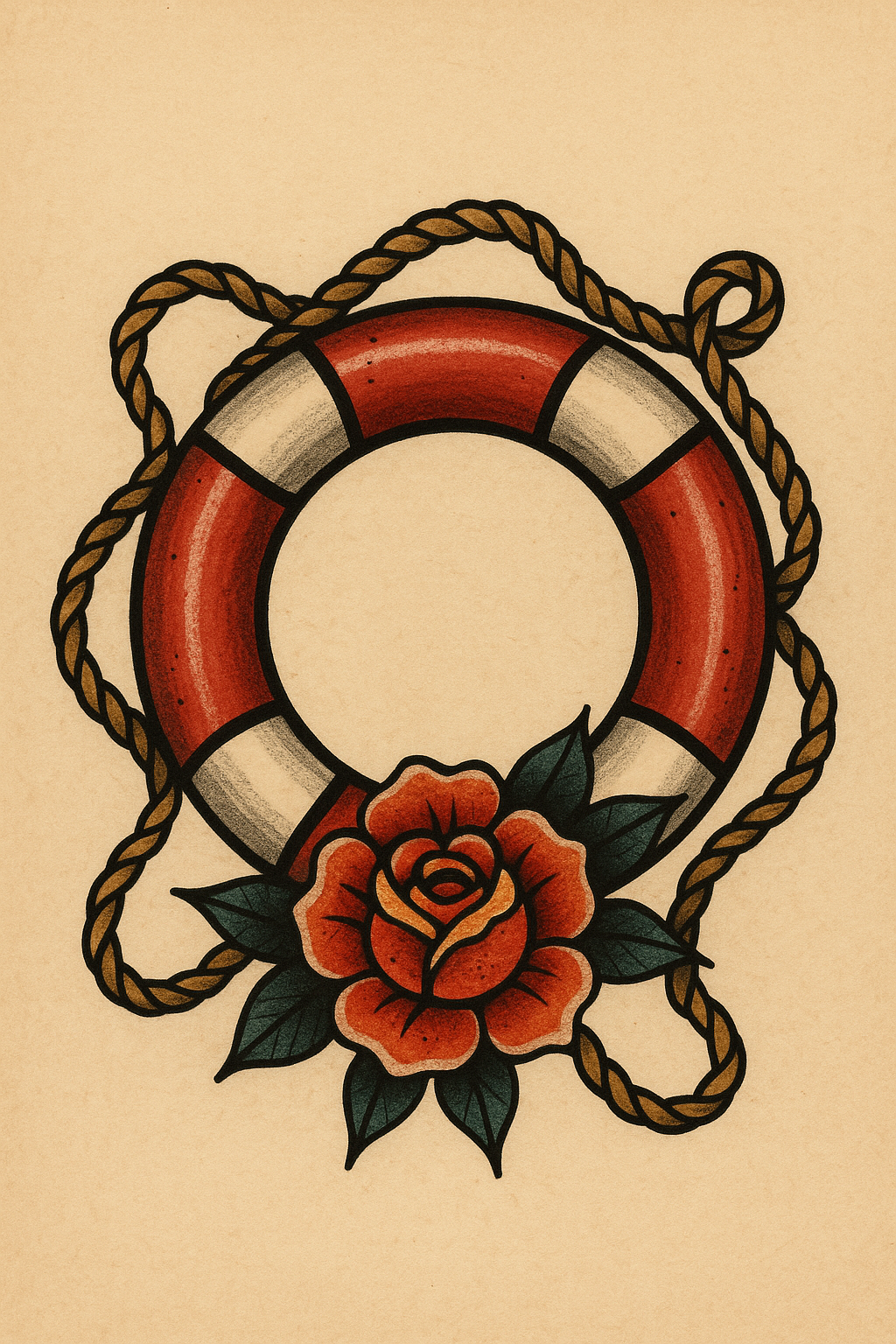 This image features a stylized lifebuoy entwined with a rope and adorned with a rose. It is an illustrative graphic ideal for nautical-themed art or tattoo designs.