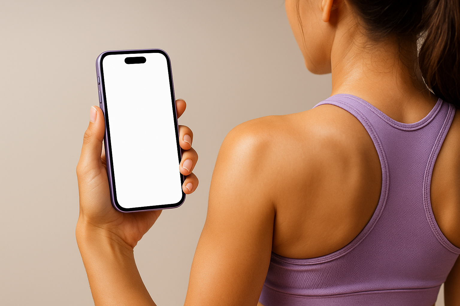 A sporty woman in a purple top holds a purple smartphone with a blank white screen, captured from behind to emphasize her athletic build and dynamic pose.