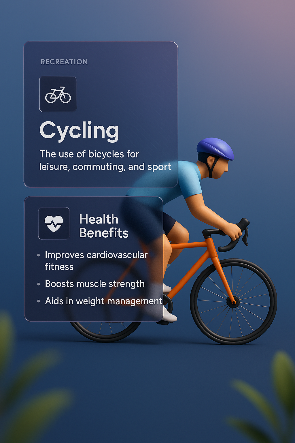 A vibrant 3D illustration of a cyclist on a gradient background. Two integrated informational blocks highlight cycling's benefits, featuring readable text and icons.