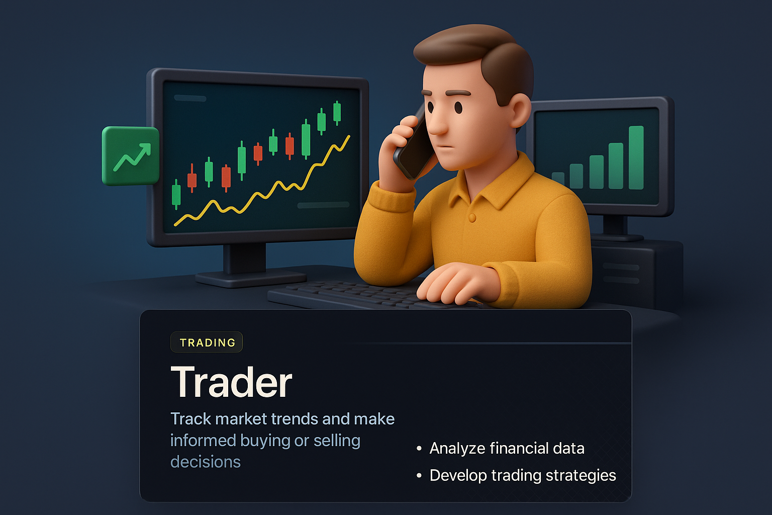 A detailed 3D illustration featuring a trader on the phone, analyzing financial charts on computer screens, set against a dark gradient background.