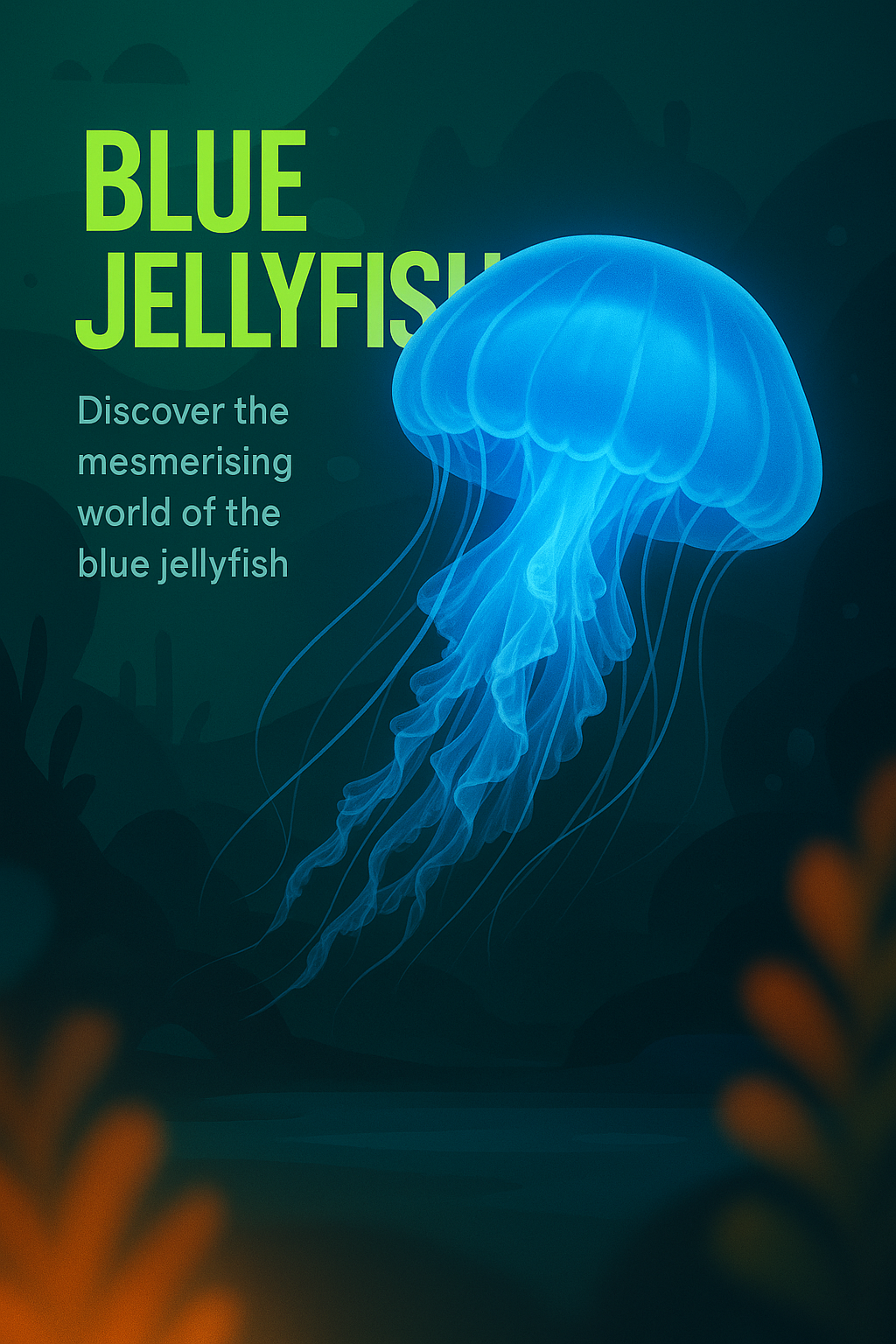 Vibrant digital illustration of a blue jellyfish, set against a dark underwater background, designed to captivate and inform about marine life.