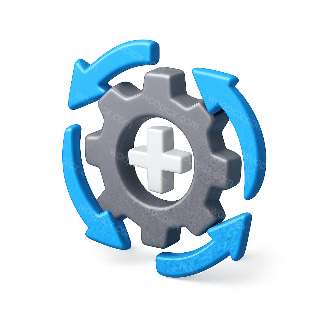 /Premium/Collection: /by davooda/Type: PNG/A 3D icon featuring a gear with circular arrows around it, presented in a three-quarter isometric view. The gear has a subtle metallic texture, and the arrows are bright blue, enhancing the dynamic feel.