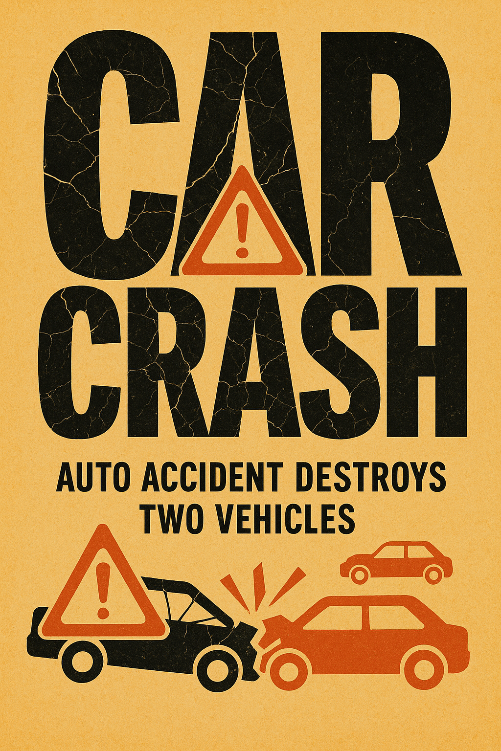 A bold graphic depicting a car crash incident with warning symbols and distressed typography, suitable for safety awareness campaigns or accident reports.