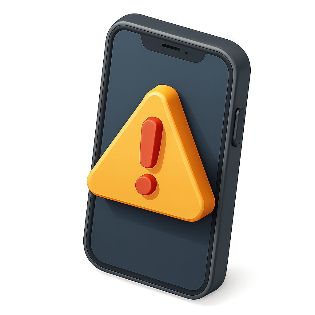 A stylized 3D smartphone displaying a prominent yellow warning triangle with an exclamation mark. The design features a sleek, modern look with a three-quarter view and a transparent background.