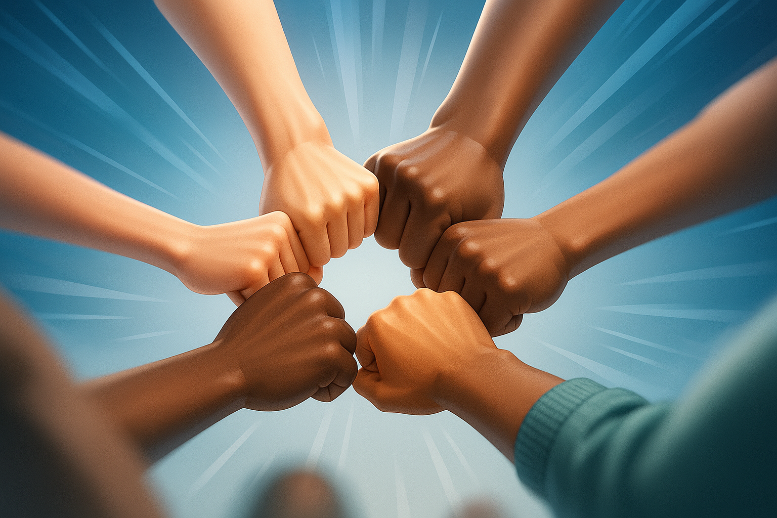 /Collection: /by davooda/Type: PNG/A dynamic illustration featuring hands of various races coming together in a fist bump, symbolizing unity and equality. The image conveys a strong message against discrimination.