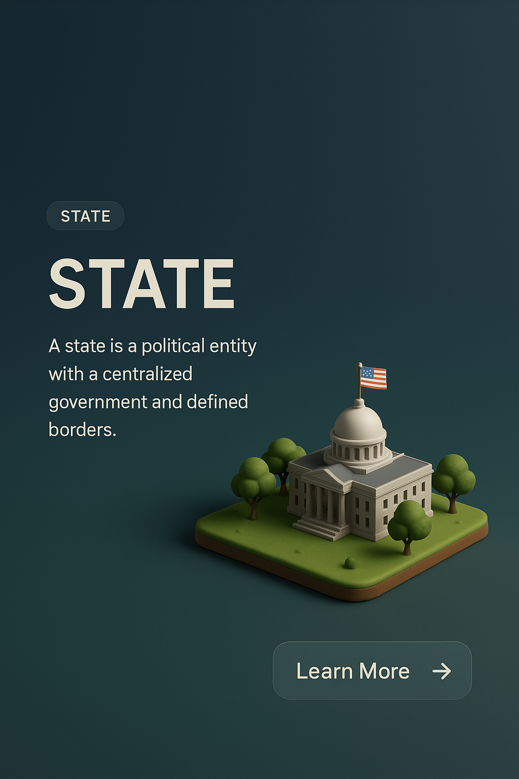 A minimalist 3D illustration depicting a state with a central government building on a grassy base. The background features a smooth gradient transitioning to a darker shade, enhancing the visual appeal.