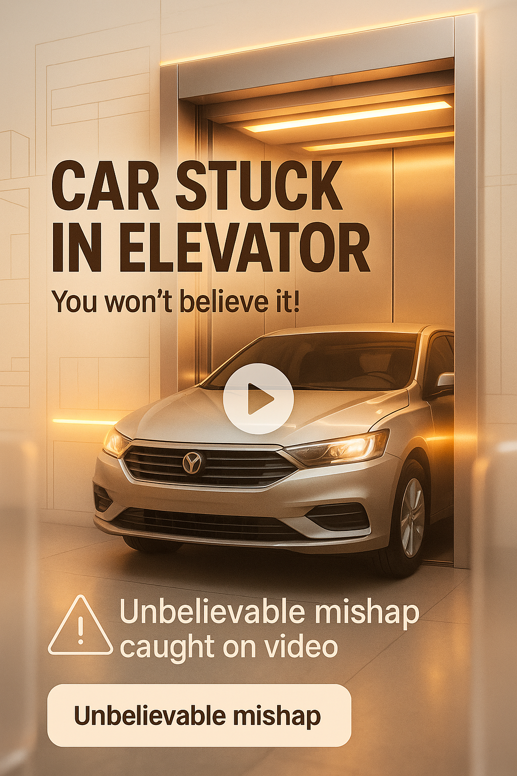 This image is a social media post featuring a car stuck in an elevator, designed to attract viewers to an engaging video. The modern design and bold text emphasize the unexpected nature of the incident.