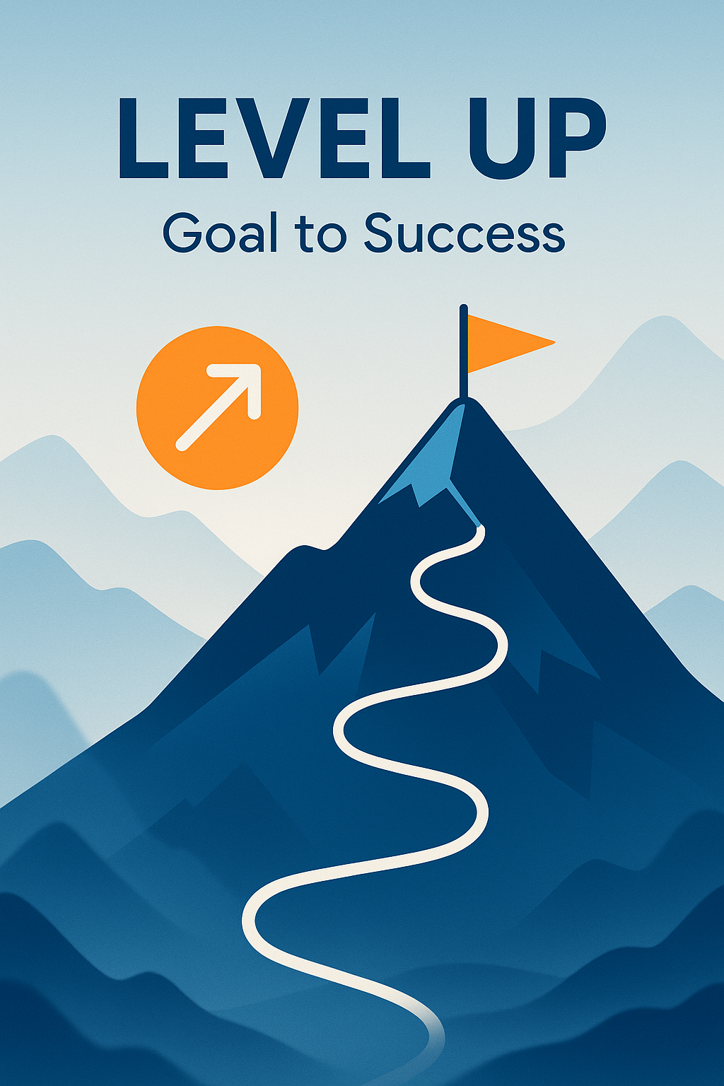 Illustrative graphic depicting a mountain landscape with a winding path leading to a flag at the peak, symbolizing achievement and motivation. Ideal for personal development or business themes.