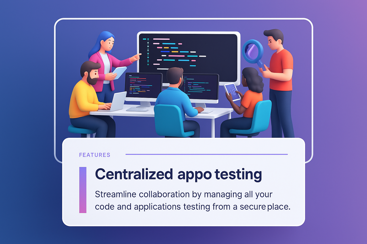 /Collection: /by davooda/Type: PNG/A vibrant scene depicting a diverse team of software developers engaging in coding and application testing within a modern workspace. Features a gradient background and a central text block highlighting app testing.