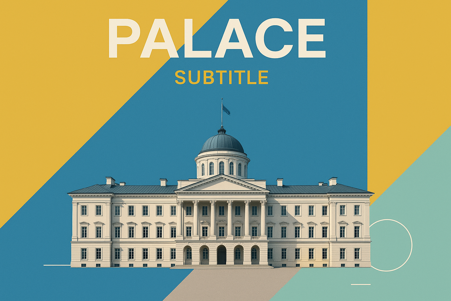 A clean and modern graphic design showcasing a palace with a minimalist style, featuring a structured color block layout. The composition is dynamic yet orderly.