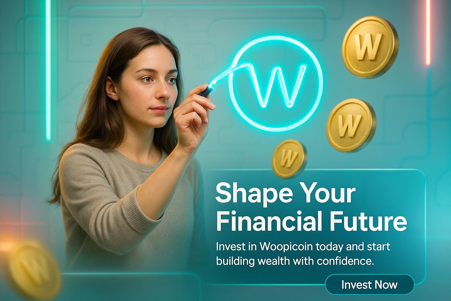 /Collection: /by davooda/Type: PNG/A visually engaging promotional graphic highlighting investment in Woopcoin. The design features vibrant colors, a modern aesthetic, and elements that convey financial growth and confidence, suitable for digital marketing.