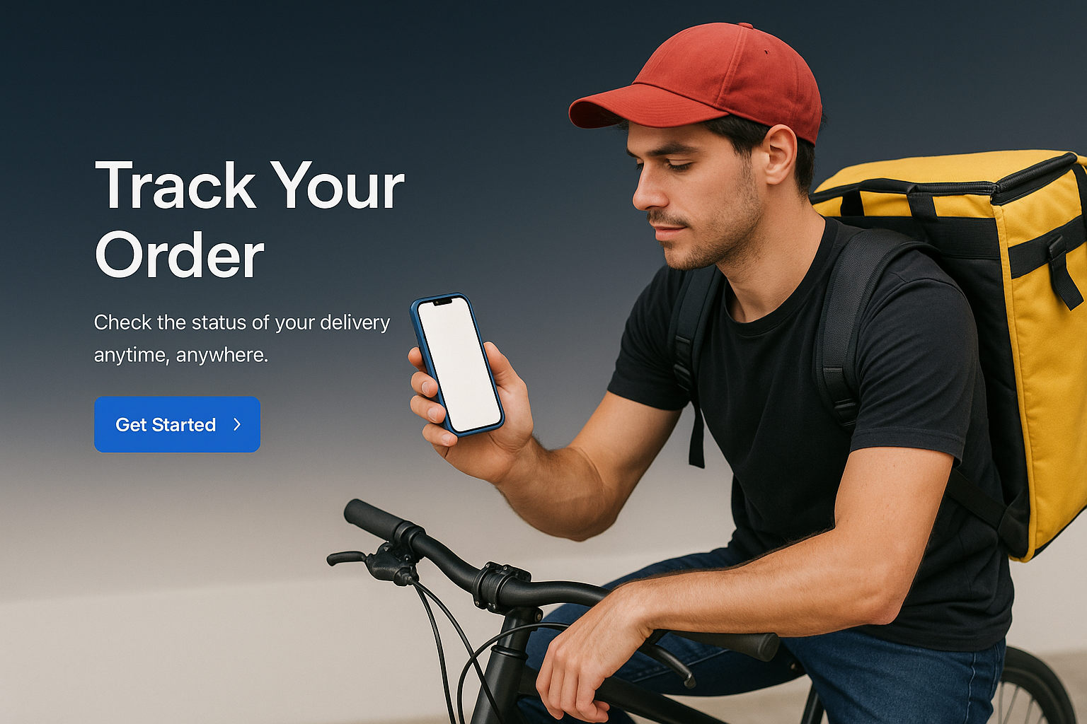 /Collection: /by davooda/Type: PNG/A courier dressed in casual attire holds a blue smartphone while sitting on a bicycle. The background features a gradient from dark to light, enhancing the focus on the courier.