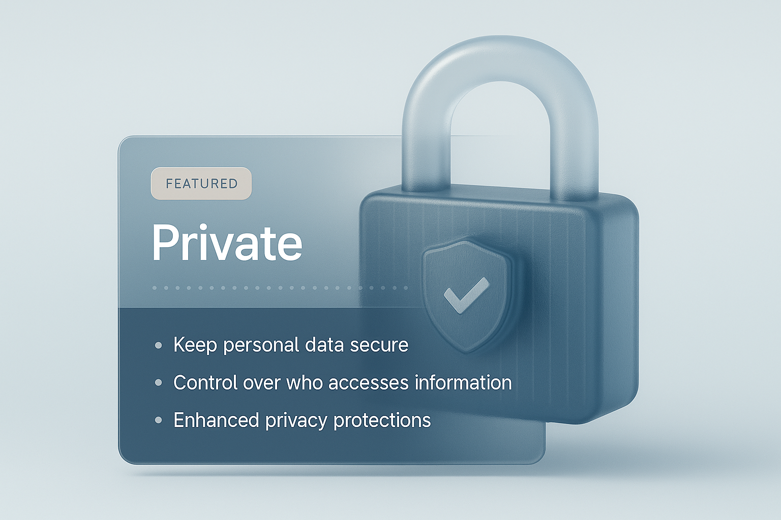 /Collection: /by davooda/Type: PNG/A modern web design concept showcasing a 3D illustration of a padlock with a shield, emphasizing privacy. The layout includes a light gradient background and text blocks detailing key features.