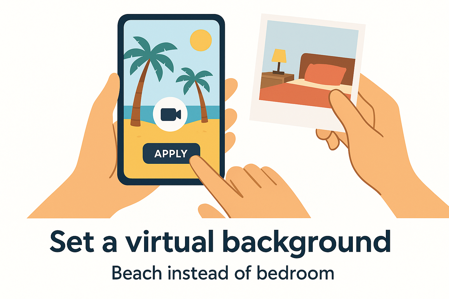 /Collection: /by davooda/Type: PNG/A digital illustration depicting how to set a virtual background in video calls, featuring a smartphone interface and hands applying a beach scene. Ideal for tech-related content.
